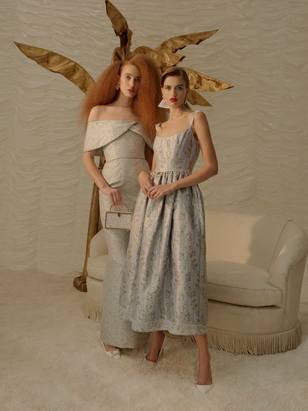 Meanwhile, the Elyse pleated denim dress by Emilia Wickstead has our Sunday brunch plans written all over it! Additionally, it has a tailored corset-style bodice with wide shoulder straps and a pleated mid-length skirt made for twirling. Therefore, it truly is everything we could wish for in a weekend summer day dress – and more!