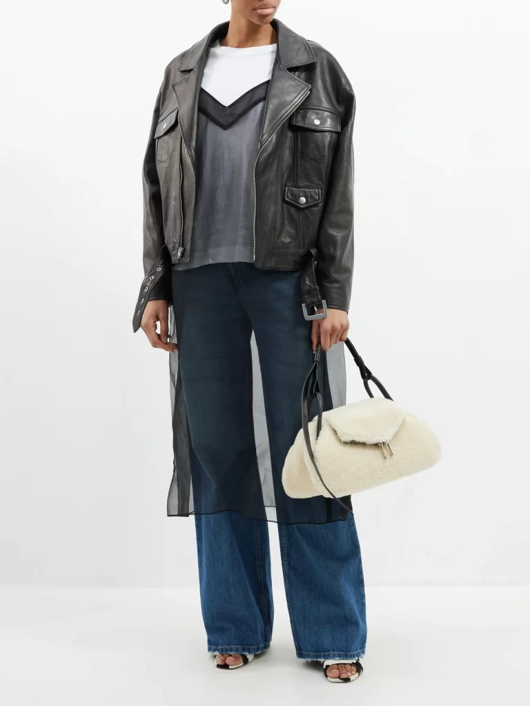 We adore this AMINA MUADDI bag for its undeniable stylish appeal. The white-hued shearling composition with the contrasting leather trim bestows a chic finish.