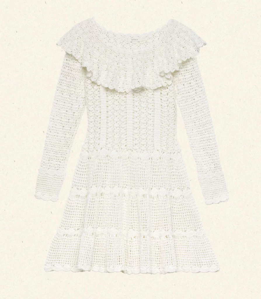 Made entirely by hand, the DÔEN Heirloom Capucine Dress is a treasure meant to be cherished for years to come. Drawing inspiration from the hand-knit lace of the Victorian era, the Capucine features a wide scoop neckline with a crochet ruffle, a fitted bodice, long sleeves, and a swingy mini skirt.