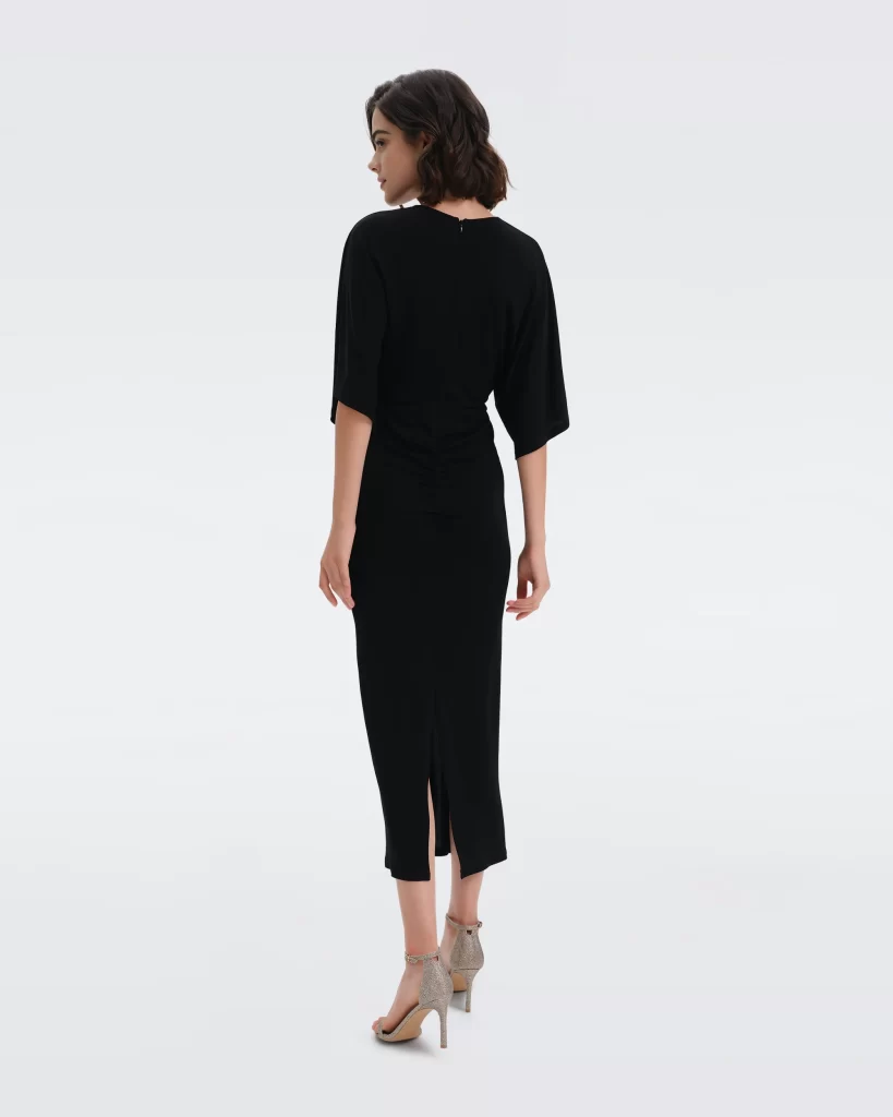 Feminine and elegant, this Diane von Furstenberg Valerie Dress will surely turn all the heads your way. Cut from a light and single-layer matte jersey, this midi black dress has a V-neckline, back split detailing and subtle ruched detailing on the front with self-tie fastening. The stretch-fit silhouette promises to flatter your figure while wide, relaxed sleeves add a touch of sophistication. It also includes a zip to the back for easy on.