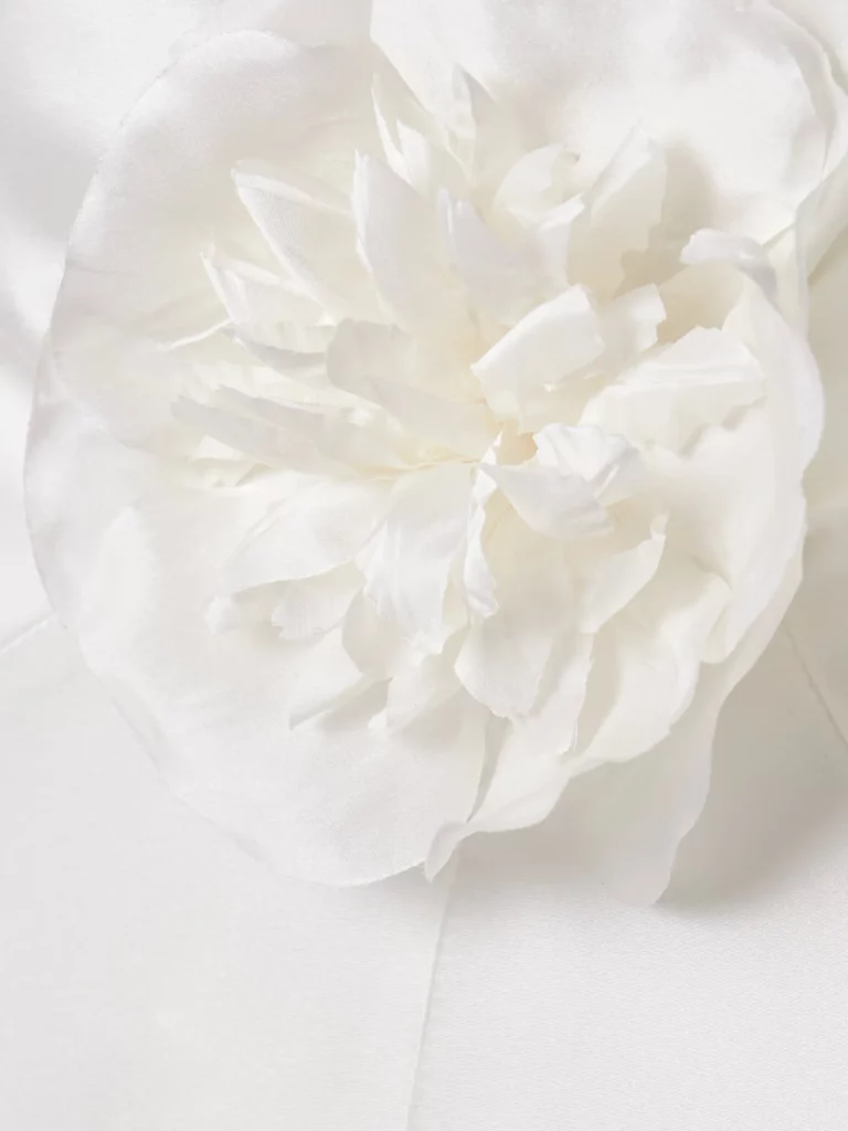 When it comes to romantic, contemporary bridal wear, Rodarte is the name to know. This gown is cut from glossy silk-charmeuse and has an elegant halter neckline and low, open back. It’s adorned with a floral pin that can be detached, or even incorporated into an updo.