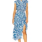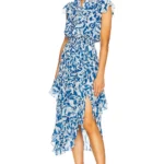 The Ilysa dress epitomizes effortless sophisticationย Black Lapis Eye printed crinkle chiffon with lurex clip dots. Featuring ruffle-detailed cap sleeves to complement the ruffle trimmed placket with button closure. An elastic smocked waistband leads into an ankle grazing asymmetric skirt with cascading ruffles and side slit.