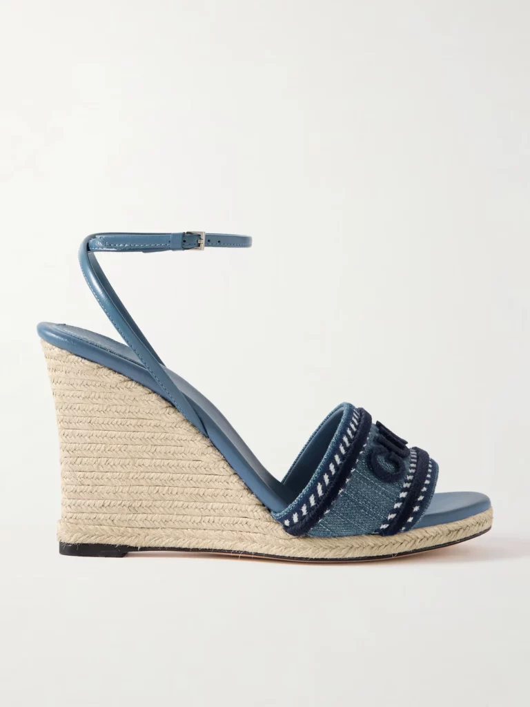 Gucci’s espadrille sandals are the perfect complement to carefree summer dressing. They’re made from denim appliquรฉd with the logo and have thin leather straps. The woven wedge heels offer generous lift.